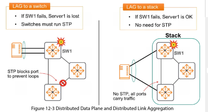 By connecting a server via a LAG connection to 2 different switches in a stack, if one switch fails the server can still send and receive traffic using the link to the other switch in the stack. There is no need for STP as the stack operates from a single control plane.