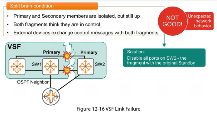 Using MAD, if a VSF link failure occurs the Standby member verifies the primary member status first using another method before it becomes the primary. If the original Primary is up then all members, that are not the primary, will disable all their ports.