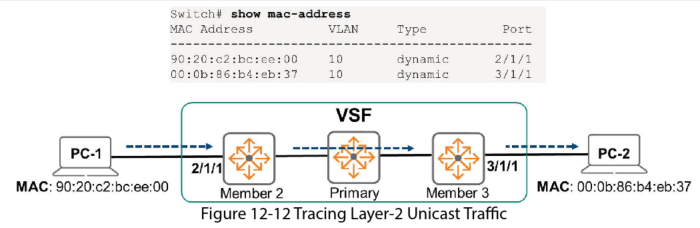 When a VSF member receives a frame for L2 forwarding it consults the L2 forwarding table to determine the egress interface. If the egress interface is on another member, the source member forwards the packet on the VSF link.