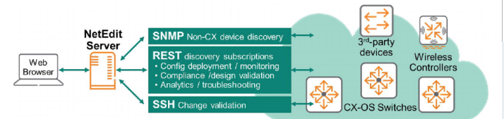 NetEdit provides coordinated switch configuration, monitoring and troubleshooting. It provides intelligent, error-free configuration with validation for consistency and compliance, and the automation of multi-device change workflows without the overhead of programming.