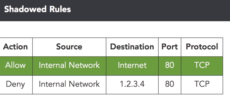 This is when a more broad rule is above a more specific rule. This means all traffic will caught by the more broad rule before it reaches the more specific rule. The specific rules should be above the broad rules.