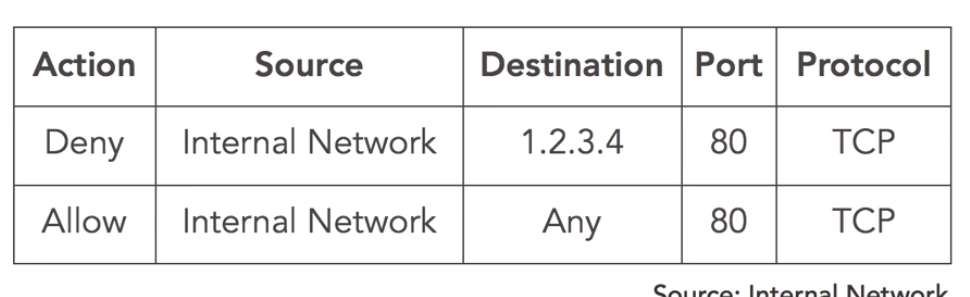In the example above they are trying to block access from the internal network to a malicious server (IP:1.2.3.4). But if the rules are in this order it will never get blocked because the rule above says allow all traffic to the internet. This can easily fixed by re-arranging the order of the rules: