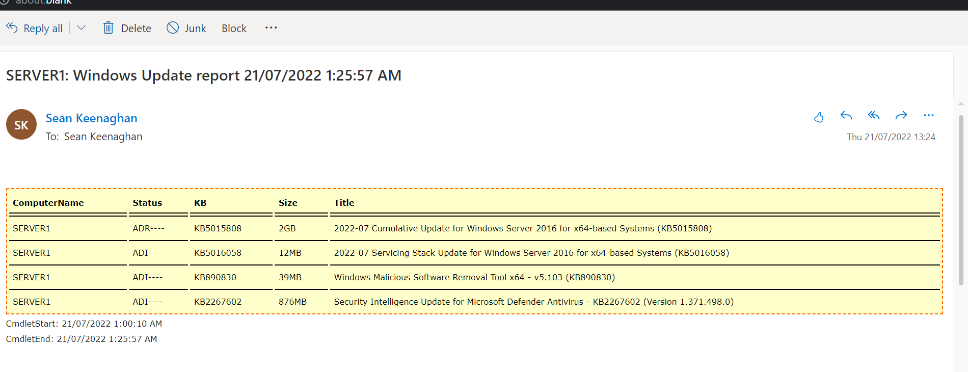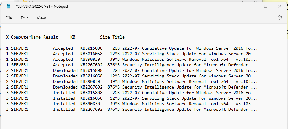 This way I can easily go through each month and see what servers had updates and which updates were installed. This is handy is you are checking to see if a particular update KB was installed