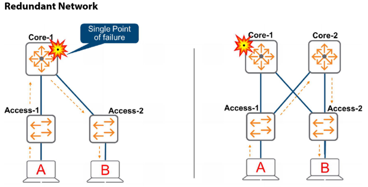 In the above example on the left, if Core 1 fails then the network is down and client A won’t be able to communicate with client B.