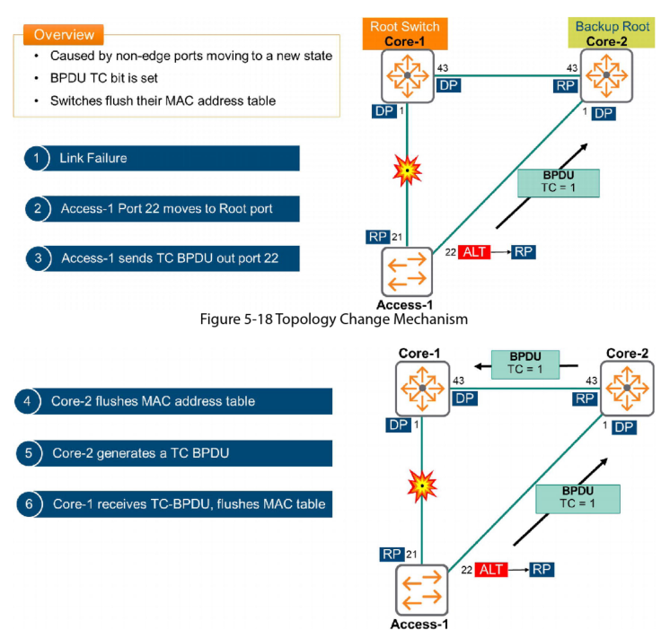 - This switch informs the rest of the switches in the network by setting the TC (Topology Change) bit in the BPDU and transmitting these BPDUs