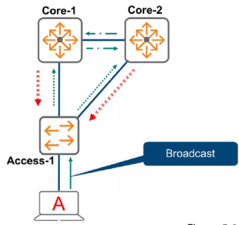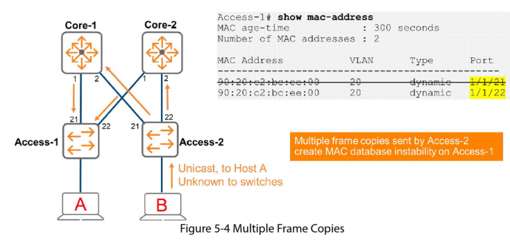 - Both Cores send a copy to Access 1 switch. This switch now believes it can reach Host B via ports 21 and 22. Access 1 is confused, Host B can only exist in one place but it appears in 2 places