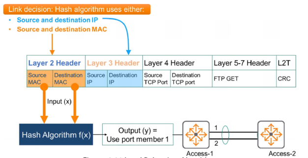 In this example the MAC source and destination addresses are used as inputs for the algorithm. The output is to use port1 for all packets with this source and destination MAC address combination. Only a link failure will cause port 2 to be used for these packet