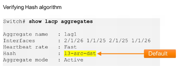 In AOS-CX the default input information for the hash algorithm are the Layer 3 Source and Destination IP addresses. You can verify this by using the show LACP aggregates command. In the example below you can see the highlighted hash information: